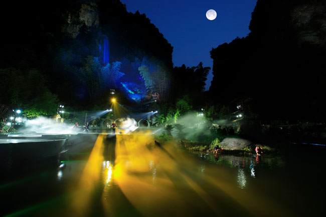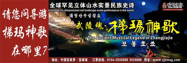 《武陵魂•梯瑪神歌》是一場(chǎng)記述土家族起源、演變、戰(zhàn)爭(zhēng)、生產(chǎn)生活等內(nèi)容的大型立體山水實(shí)景演出,揉合了音樂(lè)、舞蹈、文學(xué)等多種藝術(shù)形式,如幻如夢(mèng)的舞美燈光,搖曳生姿的原生態(tài)歌舞……濃縮了土家族數(shù)千年的發(fā)展歷史,400多名演員以自然淳樸的表演充分的展示了土家的民族文化特征,給游客帶來(lái)了耳目一新的感受。一場(chǎng)視聽(tīng)的饕餮盛宴,一曲驚天地、泣鬼神的曠世古歌,給人山水文化光影視聽(tīng)的享受!境銎罚簭埣医缣莠斏窀栉幕瘋鞑ビ邢薰尽