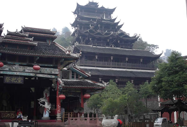 九重天 九重天世襲堂是土家風(fēng)情園的精華和靈魂所在。該建筑由土家民間藝人李宏進設(shè)計,依80度陡坡而建,高48米,共9重12層,整個樓房全部用木栓連接,沒有一顆鐵釘,堪稱土家族建筑史上的奇跡。2002年9 月22日,九重天吊腳樓被載入世界吉尼斯世界紀錄,認定其為目前中國最大、最高、最完美的木質(zhì)結(jié)構(gòu)吊腳樓。2001年4月6日,朱镕基總理視察土家風(fēng)情園時,對九重天贊不絕口:“一批民間匠人能造出這樣輝煌的吊腳樓,而且還解決了力學(xué)的問題,真是不簡單。”清華大學(xué)著名建筑學(xué)家何重義先生說:“張家界土家風(fēng)情園完全可以和蘇州的園林相媲美。特別是九重天世襲堂,猶如玉宇瓊閣,令人神往!”古人說,天有九野,地有九州,土有九山,山有九寨。古人又把九重叫做天,說天有九重,最上一重是上帝和君主居住的地方,所以我們叫它“九重天”。