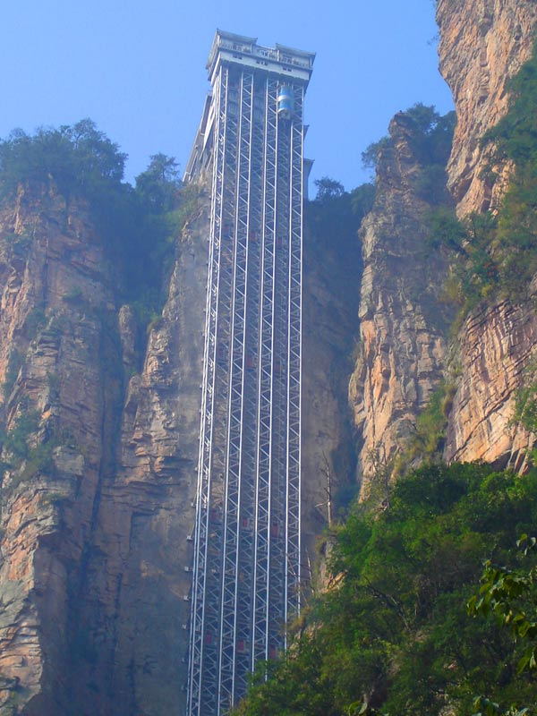 百龍?zhí)焯,垂直高?35米,運(yùn)行高度326米,由154米山體內(nèi)堅井和172米貼山鋼結(jié)構(gòu)井架等組成,采用三臺雙層全暴露觀光電梯并列分體運(yùn)行,每臺次載客50人次,運(yùn)行速度3米/秒,三臺同時運(yùn)行每小時往返量達(dá)4000人次。百龍?zhí)焯莸男藿▽崿F(xiàn)“山上游,山下住”的目標(biāo),提供了交通保障,將袁家界天下第一橋、迷魂臺、天懸白練以及烏龍寨、楊家界等絕世美景從幕后推向了前臺,并將天子山、袁家界、金鞭溪等精品旅游線路連為一體,解決了多年困擾景區(qū)的交通瓶頸問題。