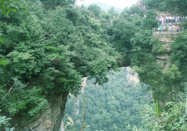 張家界天下第一橋 “天下第一橋”。橋長(zhǎng)20米,寬僅1.5至3米不等,但較平坦,可通行人。橋上蒼松挺拔,橋下云霧蕩漾,萬(wàn)丈深淵。四周懸崖絕壁,水滴飛濺。踏上橋面,使人有凌空御風(fēng)之感。手扶鐵欄桿,仰視,青峰飄渺于云靄繚繞之中;俯瞰,奇峰如筍群,巖壑深谷中陣陣煙嵐泛起,散而復(fù)聚。這里是張家界風(fēng)景一絕,是大自然的一個(gè)奇跡。您看,兩座山峰被一條長(zhǎng)廊連在一起,形成天然橋洞,平時(shí)吞云吐霧,氣勢(shì)壯觀雄奇.橋面寬約兩米,長(zhǎng)20余米,絕對(duì)高度350米。橋上蒼松挺拔,橋邊古藤垂掛,橋下深不可測(cè)。遠(yuǎn)觀此橋,云霧繚繞,橋身若隱若現(xiàn),好似水中倒影一般。走在橋上,只見霧氣蒸騰,松濤呼嘯,石橋好像也顫顫悠悠,晃晃搖搖似的,令人驚心動(dòng)魂。這里是張家界風(fēng)景一絕,是大自然的一個(gè)奇跡。