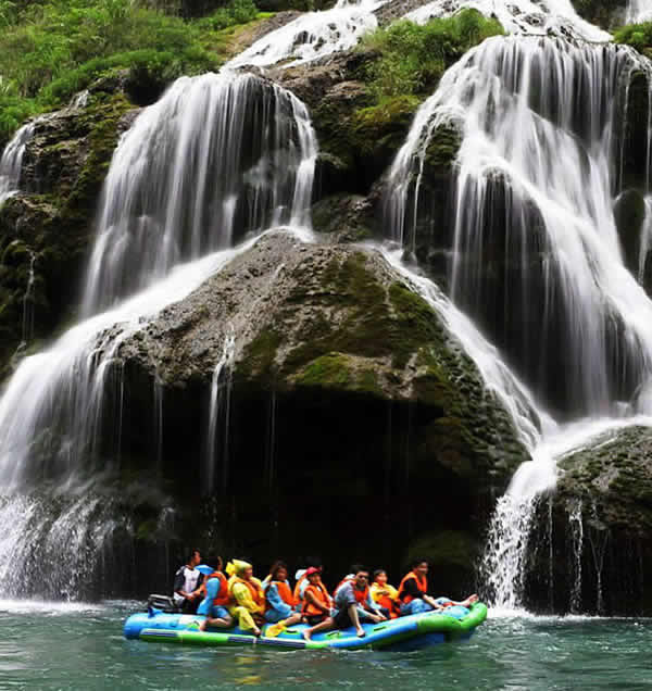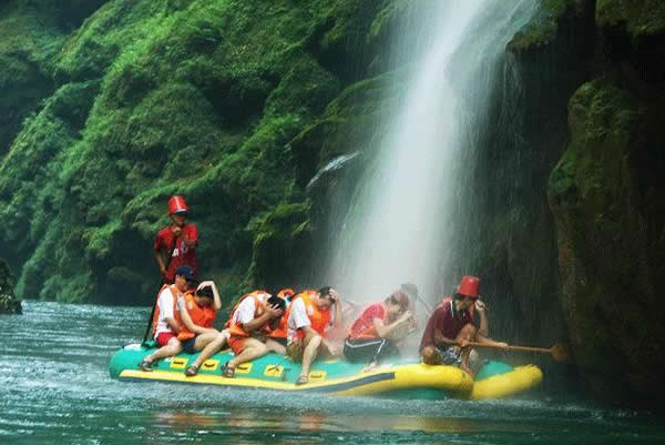 茅巖河漂流 茅巖河沿途的眾多飛瀑流泉中,尤以水洞瀑布最為壯觀迷人。瀑布從70多米高的峭壁瀉出,漫流過三級(jí)凸凹不平的峭壁,形成長短不一的三疊,瀑水在每級(jí)的石臺(tái)上漫過突兀出來的溝溝槽槽飛流而下,或?qū)捜玢y河,或窄似白練,或似垂掛的水簾,或似串串銀珠,飛落茅巖河中,撞擊得河水顫顫悠悠,鱗光閃閃。