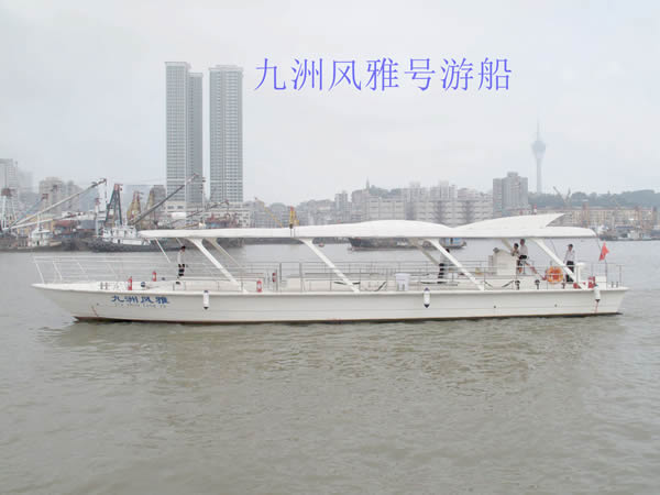 “九洲風(fēng)雅”號(hào)游船:船長23.08米,寬5.03米,擁有80客位。此船造型簡約,有很強(qiáng)的時(shí)尚設(shè)計(jì)感,與馬爾代夫的游船同款。